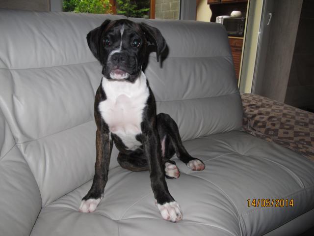 Ma petite Boxer Dahlia est agé de 2 mois, elle est a la maison depuis maintenant 2 jours, elle est déja propre, ne demande pas la porte mais ne s'est jamais échapé dans l'appartement, c'est adorable et merci pour tout les beau commentaire sur le boxer c'est surtout en surfant sur le net et en me renseignant sur de sites comme celui ci que j'ai finalement opté pour adopté un boxer. seulement 2 jours et moi et mon conjoin sommes déja en amours avec elle, meme grand papa et grand maman n'ont pu lui résisté.