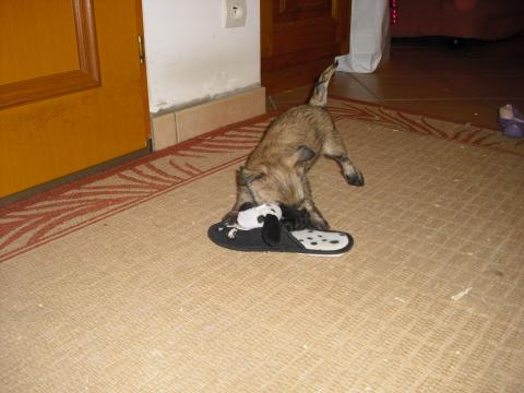 Nous gardons pendant les vacances la petite chienne de 15 mois de notre fille; elle est absolument délicieuse, vive, drôle, joueuse, affectueuse, courageuse sans agressivité, curieuse et toujours en mouvement. Elle obéit quand ses intentions sont les mêmes que les nôtres, goûte à tout: lunettes, chaussons, capitonnage des meubles qu'elle démonte à merveille, cherche le moindre trou dans la clôture pour aller se balader.