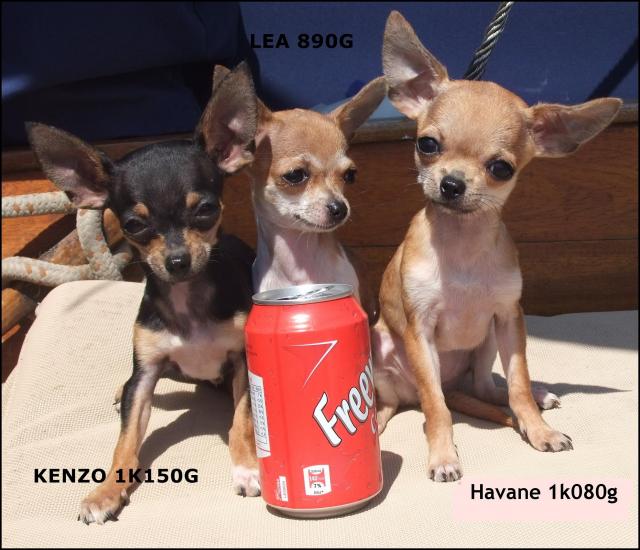 je viens d'aquérie une petite chihuahua qui s'apelle angy elle pese 620g elle est très vive et trés coquine mais je voulais prévenir les gens que avec de jeunes enfants ce n'est pas trés conseiller cela reste des chiens fragiles les premiers mois même si ils sont trés joueurs ils se fatiguent vite et avec les autres chiens faire comme trés attention je vous dit ça par connaissance de cause mais ils sont adorable et trés calins