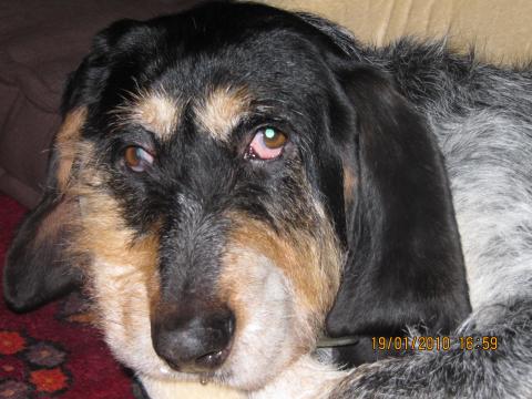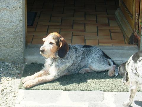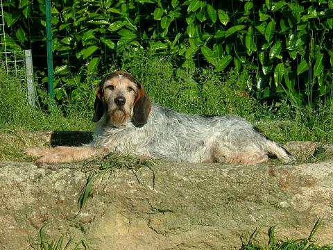 Voici notre griffon bleu récupéré il y a presque 1 an à la S.P.A.; c'est un croisé mais nous trouvons, suite à la lecture de cet article qu'il ressemble beaucoup au griffon bleu de Gascogne. Teal'c nous rend très heureux, c'est un chien très calme, qui aboit très peu, qui est très gentil avec les gens et avec toutes les bêtes (il aimerait même beaucoup jouer avec le hamster), il est aussi très câlin. Il a 12 ans et est aujourd'hui encore en pleine forme; malgré son grand âge, il a très vite appris à répondre à nos appels. Nous n'estimons pas que ce soit des défauts mais si on doit lui en trouver, on peut dire qu'il est craintif et que ce n'est en rien un chien de garde.