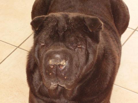 CLARK, un sharpeï noir de 20 mois, fait partie de la famille depuis qu'il a 3 mois : c'est un chien très très intelligent, et qui a beaucoup de caractère. Le mien doit être dominant, il ne supporte pas les ordres. Il réagit mal montre les crocs et grogne, nous faisons du dressage avec lui, cela va beaucoup mieux, mais je n'ai toujours pas une confiance absolue quant à ses réactions. Ce n'est pas un chien à mettre entre toutes les mains. Pour tout cela nous l'aimons à la folie. Aucun problème de peau pour notre part.