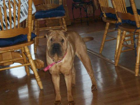 Voici ma sharpette Chanel âgée de 2 ans maintenant, très calme, bien éduquée, intelligente, fidèle, super affectueuse, c'est mon pot de colle !! lol . Depuis, 1 an, depuis sa 1e otite, dès qu'elle sort dehors c reparti ses pb elle est très fragile de ses oreilles sinon c un amour !!!