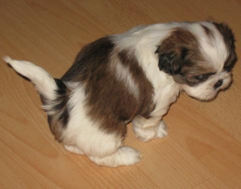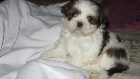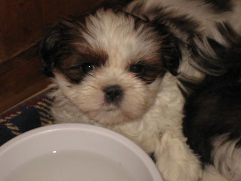 J'ai hâte d'être demain soir pour prendre mon pti shi-tzu dans mes bras. Il aura tout juste 11 semaines. C'est un mâle de couleur claire ( sa tête est blanc-beige-brun, ses pattes toutes blanches et le dos blanc et brun). Trop mignoooon. J'adore ses grands yeux tout noir.