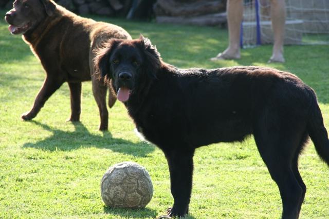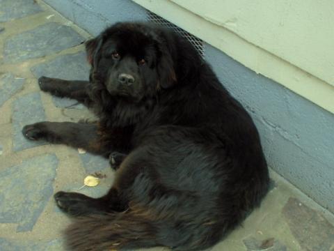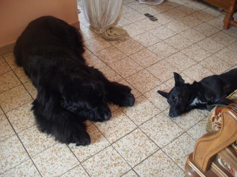 Voici mes deux chiens. Tia Delma (Une Terre neuve noir et blanc de type Landseer) et Jacob un gros mâle noir de 180 lbs. Ouch! pour les orteils quand il passe... Malgré leur grosseur et leur force titanesque, ils sont doux et très affectueux. Objets cassés dans la maison: 0. Heu sauf peut-être le verre de vin que j'ai laissé trainer sur une petite table, en tout les cas c'était de ma faute...