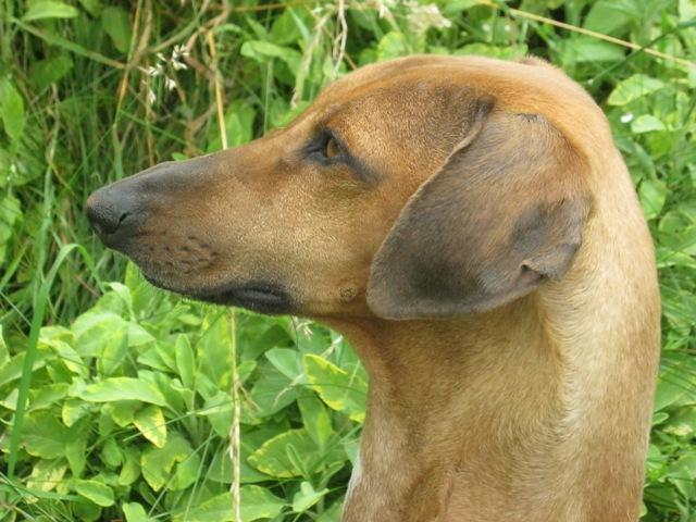 Crâne : Le crâne est presque plat, plutôt allongé. La largeur du crâne doit être nettement inférieure à la moitié de la longueur de la tête. Les directions des axes du crâne et du chanfrein sont souvent légèrement divergentes vers l’avant. Les arcades sourcilières et le sillon frontal sont peu marqués. En revanche, la crête occipitale est nettement saillante et la protubérance occipitale marquée.