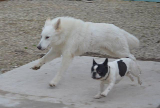 Les promenades allaient mieux (avec une longe de 10 mètres) sauf quand il rencontrait un chien ...mais il tirait sûrement moins (il ne me faisait plus tomber!).