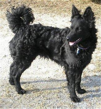 Poil : La tête et le devant des membres sont recouverts d’un poil court, droit et lisse. Sur les autres parties du corps le poil est uniformément très ondulé ou légèrement bouclé, serré, toujours brillant, d’une longueur de 3-7 cm. A certains endroits, il se forme des épis et des crêtes. Le poil est le plus long à la face postérieure de l’avant-bras et de la cuisse où il forme des franges prononcées.• Noir.