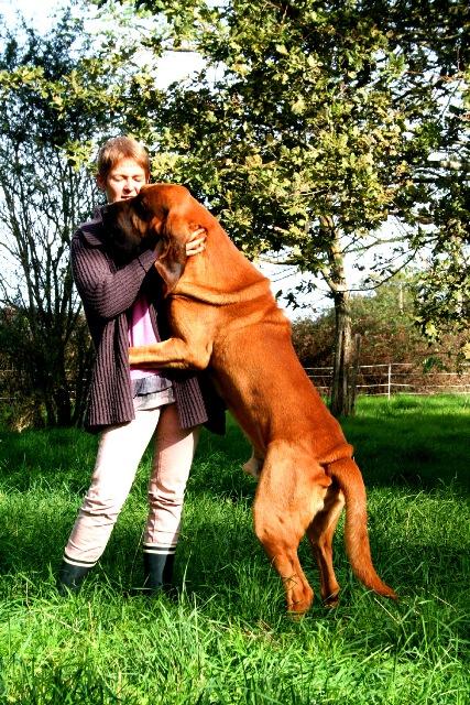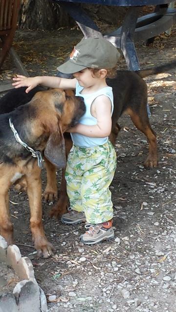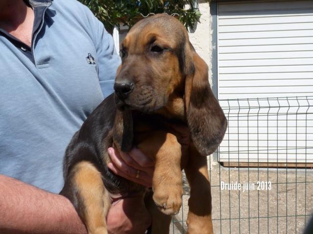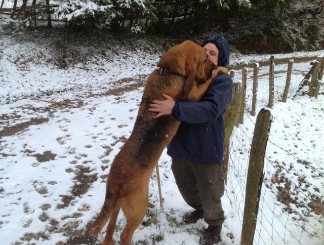 Nous avons un Saint Hubert Fraizouille,de 2 ans nous l'appelons Zouzou, elle est magnifique, baveuse , caline, obstinée,espègle, infatiguable, dormeuse, Zouzou est un rêve que j'ai pu réaliser, je suis tombée amoureuse de cette race au salon de l'agriculture , il y a 24 ans, alors je suis heureuse d'être avec elle et je profite de tous les moments que je passe en sa compagnie, cet hiver nous avons failli la perdre , elle a fait une distorsion d'estomac nous sommes arrivés à temps chez le vétérinaire, elle a été opéré avec succés . Pour qu'elle ne soit pas seul et aussi parce que depuis un mois nous avons accueilli un Golden Havana , elle 4 mois maintenant,Fraizouille est très attentive à Havanna et nous espérons qu'elle deviendront soeur de coeur